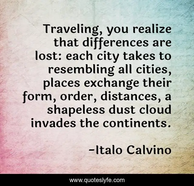 This page presents the quote "Traveling, you realize that differences are lost: each city takes to resembling all cities, places exchange their form, order, distances, a shapeless dust cloud invades the continents.". Author of this quote is Italo Calvino. This quote is about city, differences, lost,.
