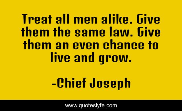 This page presents the quote "Treat all men alike. Give them the same law. Give them an even chance to live and grow.". Author of this quote is Chief Joseph. This quote is about law, treat, men,.