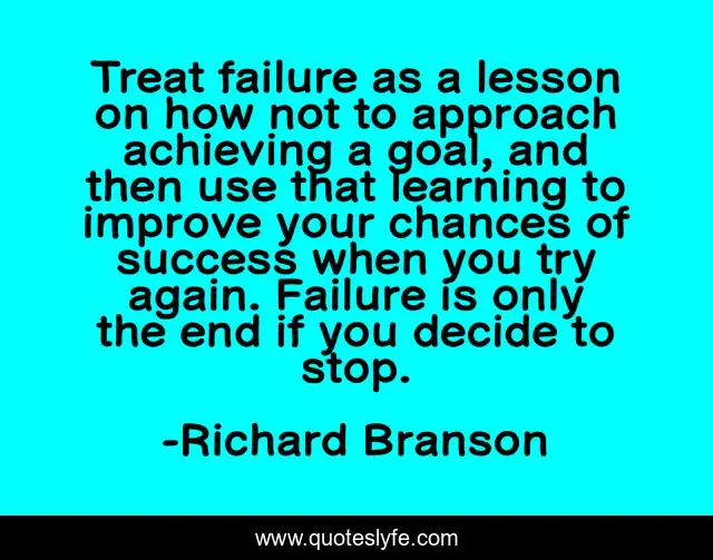 This page presents the quote "Treat failure as a lesson on how not to approach achieving a goal, and then use that learning to improve your chances of success when you try again. Failure is only the end if you decide to stop.". Author of this quote is Richard Branson. This quote is about success, learning, achieving,.