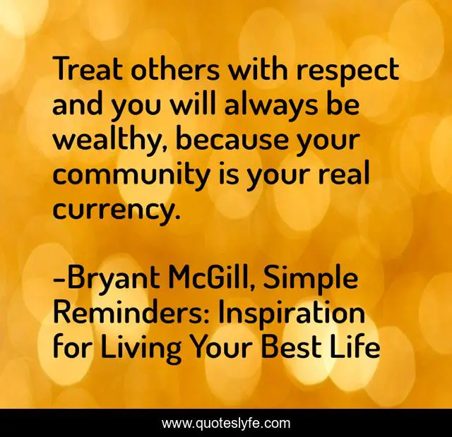 This page presents the quote "Treat others with respect and you will always be wealthy, because your community is your real currency.". Author of this quote is Bryant McGill, Simple Reminders: Inspiration for Living Your Best Life. This quote is about currency, respect, wealth, community, realness,.