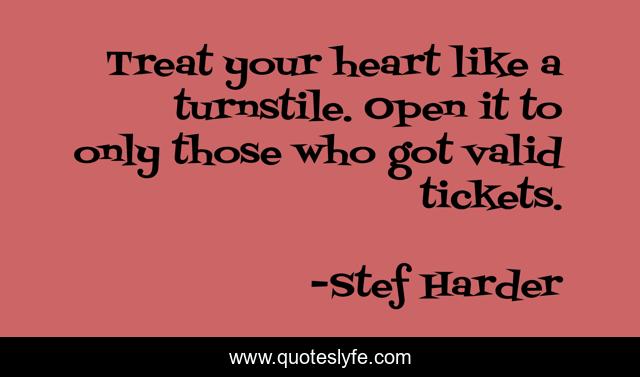 This page presents the quote "Treat your heart like a turnstile. Open it to only those who got valid tickets.". Author of this quote is Stef Harder. This quote is about relationships, heart, relationship, couple, couples, break-ups, girlfriend, hearts, boyfriends,.