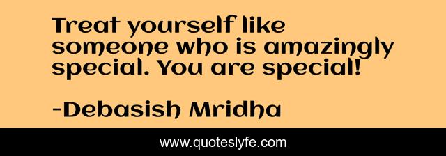 This page presents the quote "Treat yourself like someone who is amazingly special. You are special!". Author of this quote is Debasish Mridha. This quote is about quotes, philosophy, debasish-mridha, debasish-mridha-m-d, you-are-special, inspirational, self-affirmations, enthusiasm, everyone-is-special,.