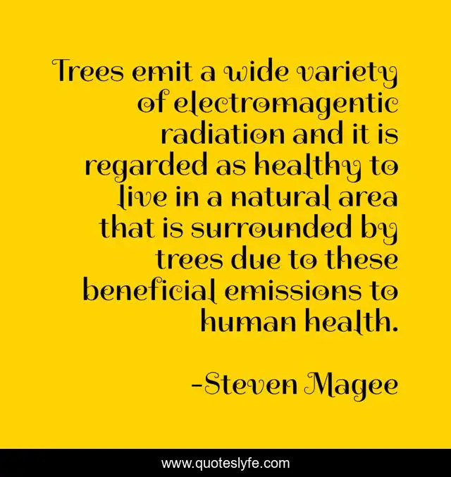 This page presents the quote "Trees emit a wide variety of electromagentic radiation and it is regarded as healthy to live in a natural area that is surrounded by trees due to these beneficial emissions to human health.". Author of this quote is Steven Magee. This quote is about wide, beneficial, natural, area, healthy, electromagnetic, regarded, surrounded, radiation,.