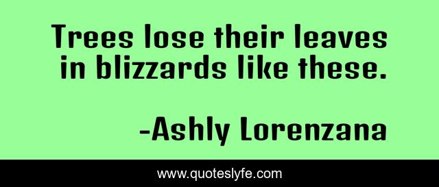 This page presents the quote "Trees lose their leaves in blizzards like these.". Author of this quote is Ashly Lorenzana. This quote is about metaphor, winter, blizzard, nature, leaves, snow, trees, sadness, despair,.