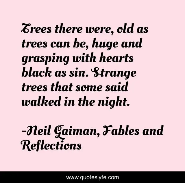 This page presents the quote "Trees there were, old as trees can be, huge and grasping with hearts black as sin. Strange trees that some said walked in the night.". Author of this quote is Neil Gaiman, Fables and Reflections. .
