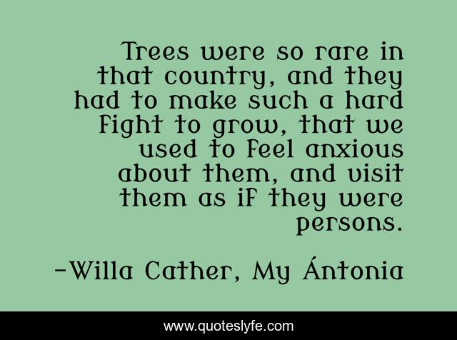 This page presents the quote "Trees were so rare in that country, and they had to make such a hard fight to grow, that we used to feel anxious about them, and visit them as if they were persons.". Author of this quote is Willa Cather, My Ántonia. This quote is about prairie, trees, nature,.