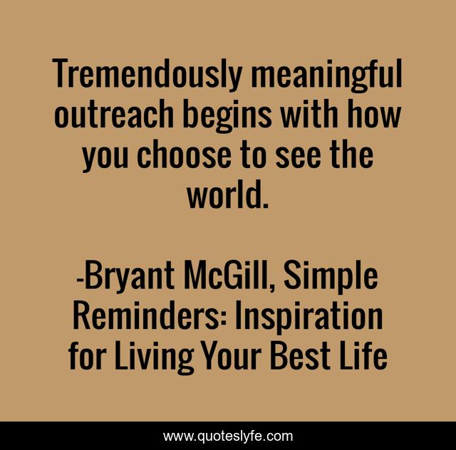This page presents the quote "Tremendously meaningful outreach begins with how you choose to see the world.". Author of this quote is Bryant McGill, Simple Reminders: Inspiration for Living Your Best Life. This quote is about seeing, beginning, meaningfulness, choices,.