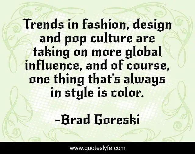 "Brad Goreski Quotes." Quoteslyfe.com, 2025. Fri. 05 Dec. 2025. <https://www.quoteslyfe.com/quote/Trends-in-fashion-design-and-pop-culture-314462>.