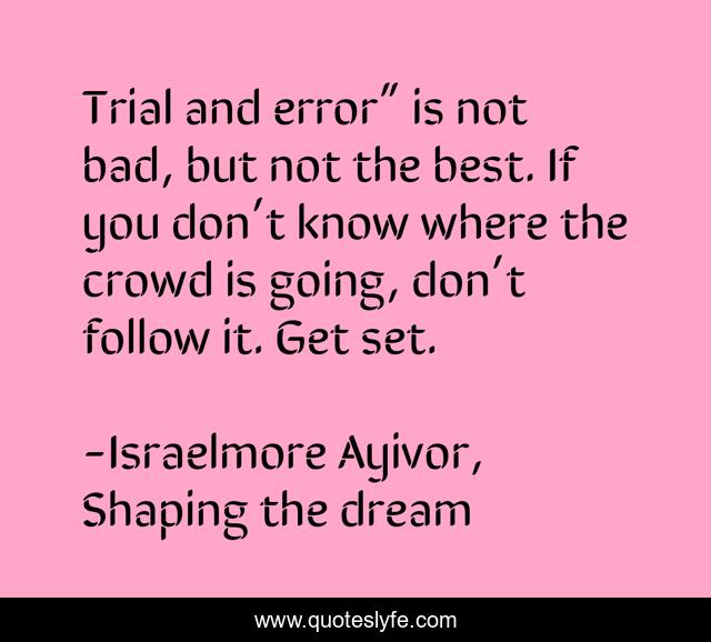 This page presents the quote "Trial and error” is not bad, but not the best. If you don’t know where the crowd is going, don’t follow it. Get set.". Author of this quote is Israelmore Ayivor, Shaping the dream. This quote is about better, food-for-thought, good, crow, not-bad, get-set, bad, trial-and-error, try,.
