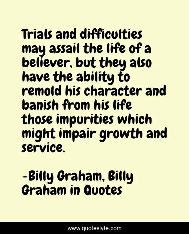 This page presents the quote "Trials and difficulties may assail the life of a believer, but they also have the ability to remold his character and banish from his life those impurities which might impair growth and service.". Author of this quote is Billy Graham, Billy Graham in Quotes. This quote is about character, billy-graham,.