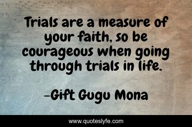 This page presents the quote "Trials are a measure of your faith, so be courageous when going through trials in life.". Author of this quote is Gift Gugu Mona. This quote is about faith, trials, faith-strength, trials-in-life, measure, courageous,.