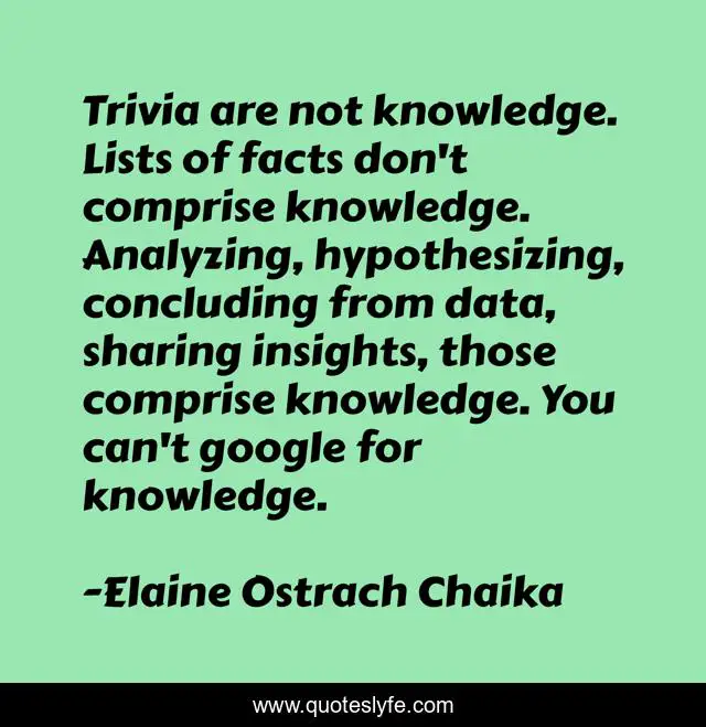 This page presents the quote "Trivia are not knowledge. Lists of facts don't comprise knowledge. Analyzing, hypothesizing, concluding from data, sharing insights, those comprise knowledge. You can't google for knowledge.". Author of this quote is Elaine Ostrach Chaika. This quote is about facts, trivia, google, knowledge, internet,.