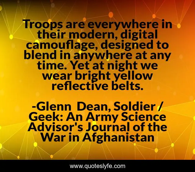 This page presents the quote "Troops are everywhere in their modern, digital camouflage, designed to blend in anywhere at any time. Yet at night we wear bright yellow reflective belts.". Author of this quote is Glenn Dean, Soldier / Geek: An Army Science Advisor's Journal of the War in Afghanistan. This quote is about afghanistan, military,.