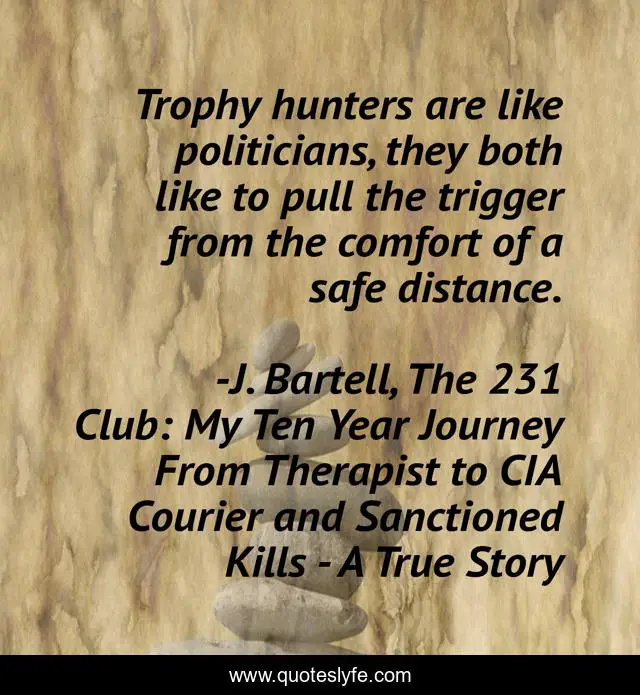 "J. Bartell, The 231 Club: My Ten Year Journey From Therapist to CIA Courier and Sanctioned Kills - A True Story Quotes." Quoteslyfe.com, 2025. Mon. 08 Dec. 2025. <https://www.quoteslyfe.com/quote/Trophy-hunters-are-like-politicians-they-both-257762>.