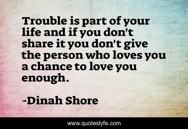 This page presents the quote "Trouble is part of your life and if you don't share it you don't give the person who loves you a chance to love you enough.". Author of this quote is Dinah Shore. This quote is about helping, people,.