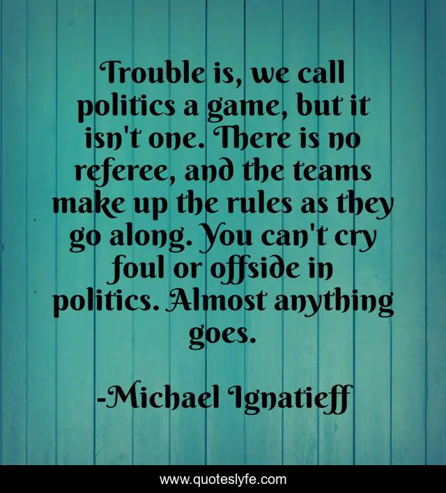 This page presents the quote "Trouble is, we call politics a game, but it isn't one. There is no referee, and the teams make up the rules as they go along. You can't cry foul or offside in politics. Almost anything goes.". Author of this quote is Michael Ignatieff. This quote is about rules, game,.