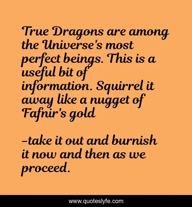 This page presents the quote "True Dragons are among the Universe's most perfect beings. This is a useful bit of information. Squirrel it away like a nugget of Fafnir's gold". Author of this quote is take it out and burnish it now and then as we proceed.. .
