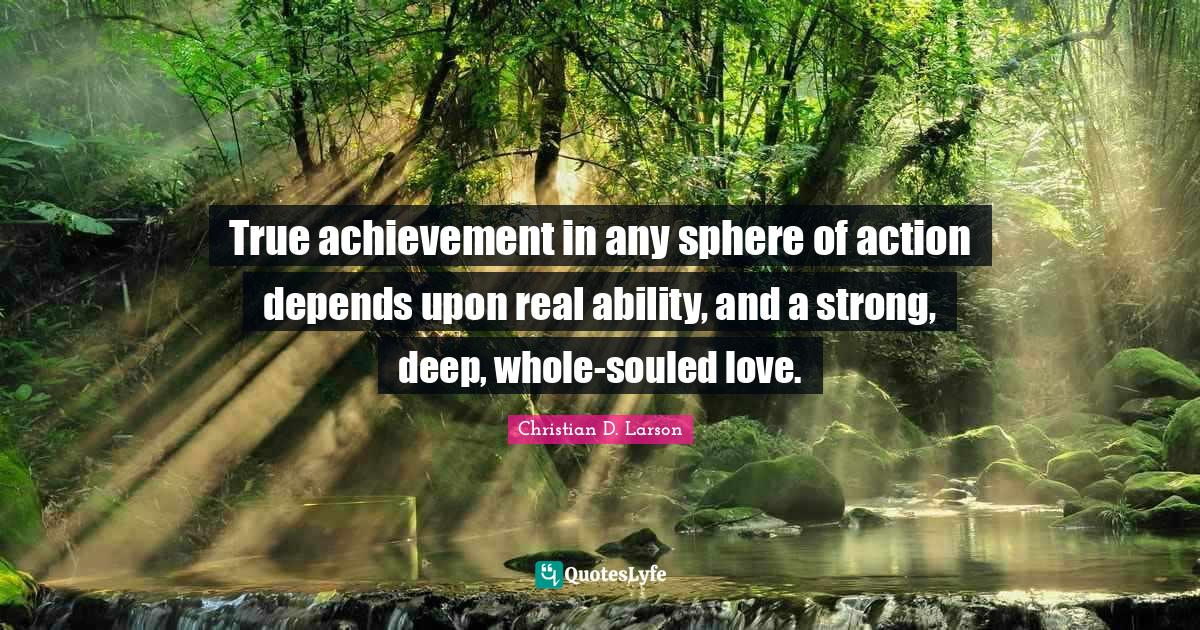 This page presents the quote "True achievement in any sphere of action depends upon real ability, and a strong, deep, whole-souled love.". Author of this quote is Christian D. Larson. This quote is about love, action, achievement, strong, depends, real, whole, ability,.
