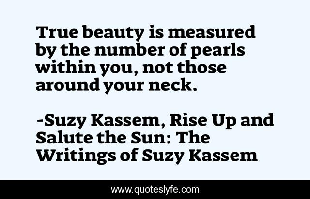 This page presents the quote "True beauty is measured by the number of pearls within you, not those around your neck.". Author of this quote is Suzy Kassem, Rise Up and Salute the Sun: The Writings of Suzy Kassem. This quote is about beautiful, spiritual, mindfulness, intelligence, patience, learning, fake, meditation, education,.