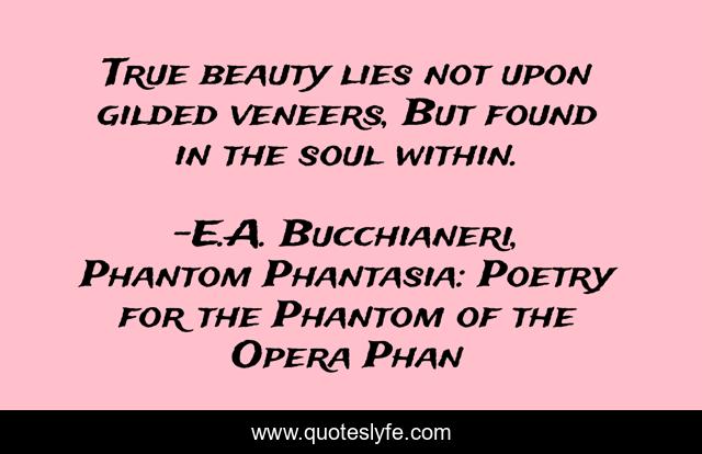 This page presents the quote "True beauty lies not upon gilded veneers, But found in the soul within.". Author of this quote is E.A. Bucchianeri, Phantom Phantasia: Poetry for the Phantom of the Opera Phan. This quote is about phantom, poem, inspirational, beauty, christine-daae, poetry, true-beauty, wisdom, philosophical,.
