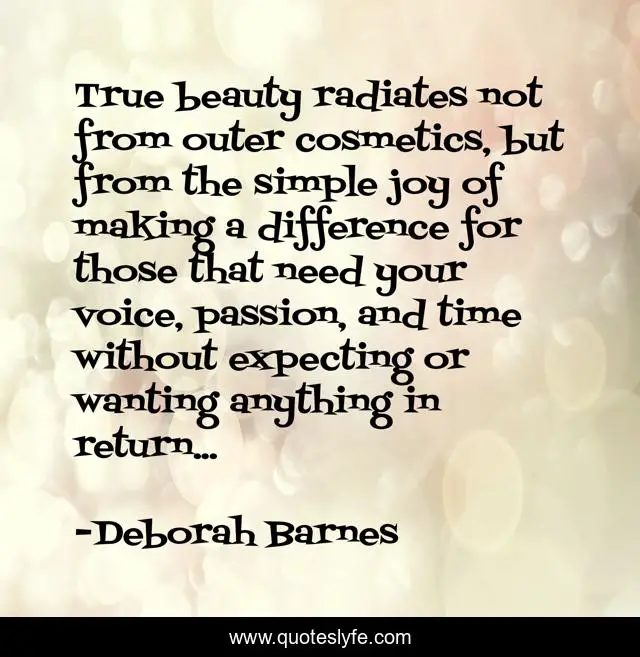This page presents the quote "True beauty radiates not from outer cosmetics, but from the simple joy of making a difference for those that need your voice, passion, and time without expecting or wanting anything in return...". Author of this quote is Deborah Barnes. This quote is about inspiration, love, true-beauty, affection, self-esteem,.