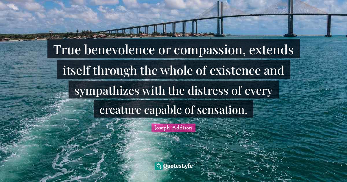 This page presents the quote "True benevolence or compassion, extends itself through the whole of existence and sympathizes with the distress of every creature capable of sensation.". Author of this quote is Joseph Addison. This quote is about existence, benevolence, distress, philanthropy, whole, compassion, animal, capable,.