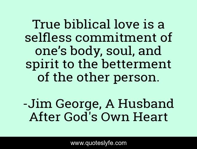 This page presents the quote "True biblical love is a selfless commitment of one’s body, soul, and spirit to the betterment of the other person.". Author of this quote is Jim George, A Husband After God's Own Heart. This quote is about body, faith, life, bible, christian, biblical, commit, blessed, soul,.