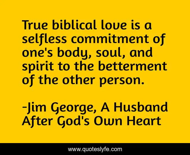 This page presents the quote "True biblical love is a selfless commitment of one's body, soul, and spirit to the betterment of the other person.". Author of this quote is Jim George, A Husband After God's Own Heart. This quote is about body, faith, bible, christian, biblical, god, love, commitment, soul,.