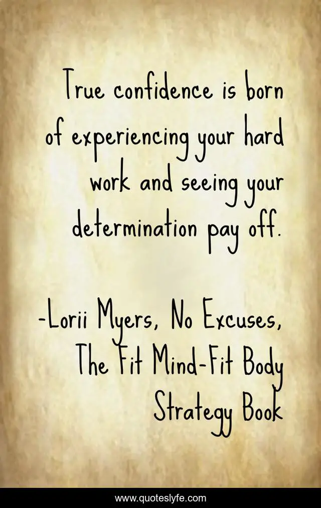 This page presents the quote "True confidence is born of experiencing your hard work and seeing your determination pay off.". Author of this quote is Lorii Myers, No Excuses, The Fit Mind-Fit Body Strategy Book. This quote is about confidence, determination,.