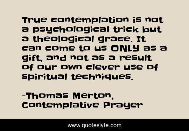 This page presents the quote "True contemplation is not a psychological trick but a theological grace. It can come to us ONLY as a gift, and not as a result of our own clever use of spiritual techniques.". Author of this quote is Thomas Merton, Contemplative Prayer. This quote is about contemplation, psychology, god, spiritual-gifts, spiritual-disciplines, meditation, grace,.