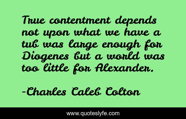This page presents the quote "True contentment depends not upon what we have a tub was large enough for Diogenes but a world was too little for Alexander.". Author of this quote is Charles Caleb Colton. .