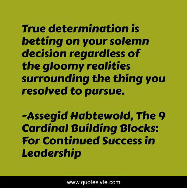 This page presents the quote "True determination is betting on your solemn decision regardless of the gloomy realities surrounding the thing you resolved to pursue.". Author of this quote is Assegid Habtewold, The 9 Cardinal Building Blocks: For Continued Success in Leadership. This quote is about decision, determination, pursuit,.