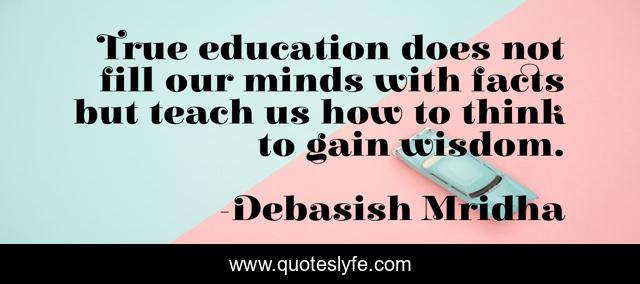 This page presents the quote "True education does not fill our minds with facts but teach us how to think to gain wisdom.". Author of this quote is Debasish Mridha. This quote is about debasish, how-to-think, mridha, philosophy, wisdom, inspirational, enthusiasm, education,.