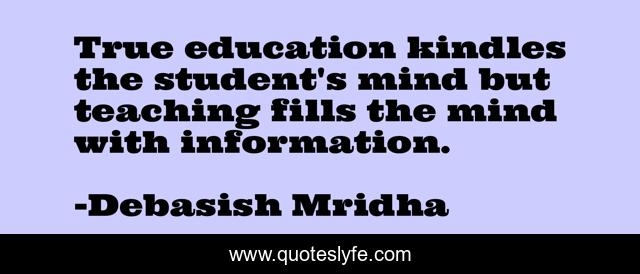 This page presents the quote "True education kindles the student's mind but teaching fills the mind with information.". Author of this quote is Debasish Mridha. This quote is about information, life, love, knowledge, inspirational, intelligence, philosophy, mind, truth,.