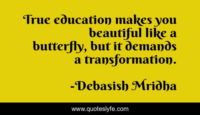 This page presents the quote "True education makes you beautiful like a butterfly, but it demands a transformation.". Author of this quote is Debasish Mridha. This quote is about true-education, education-makes-you-beautiful, philosophy, debasish-mridha, quotes, debasish-mridha-md, inspirational, enthusiasm, education,.