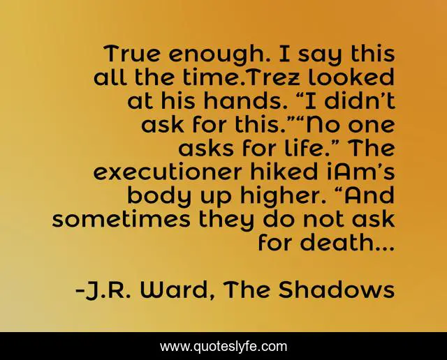 This page presents the quote "True enough. I say this all the time.Trez looked at his hands. “I didn’t ask for this.”“No one asks for life.” The executioner hiked iAm’s body up higher. “And sometimes they do not ask for death...". Author of this quote is J.R. Ward, The Shadows. This quote is about enthusiasm, life, life-and-living, inspirational,.