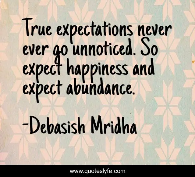 This page presents the quote "True expectations never ever go unnoticed. So expect happiness and expect abundance.". Author of this quote is Debasish Mridha. This quote is about abundance, expect-happiness, philosophy, debasish-mridha, true-expectations, quotes, inspirational, enthusiasm, debasish-mridha-m-d,.
