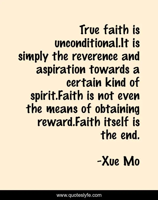 This page presents the quote "True faith is unconditional.It is simply the reverence and aspiration towards a certain kind of spirit.Faith is not even the means of obtaining reward.Faith itself is the end.". Author of this quote is Xue Mo. This quote is about faith, life, belief, spirit,.