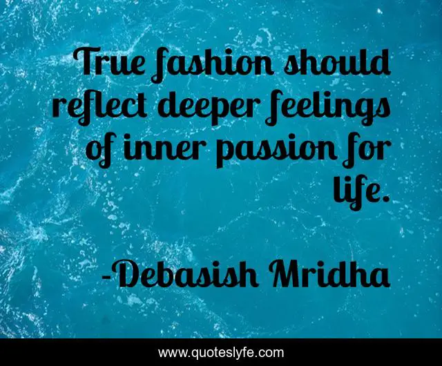 This page presents the quote "True fashion should reflect deeper feelings of inner passion for life.". Author of this quote is Debasish Mridha. This quote is about life, love, knowledge, inspirational, intelligence, philosophy, wisdom, quotes, affection,.
