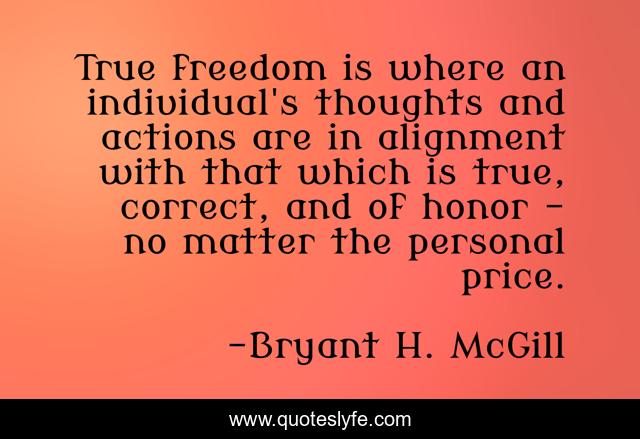 This page presents the quote "True freedom is where an individual's thoughts and actions are in alignment with that which is true, correct, and of honor - no matter the personal price.". Author of this quote is Bryant H. McGill. This quote is about personal, honor, thoughts,.