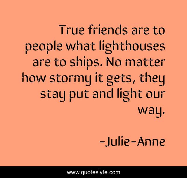 This page presents the quote "True friends are to people what lighthouses are to ships. No matter how stormy it gets, they stay put and light our way.". Author of this quote is Julie-Anne. This quote is about friends, stormy,.