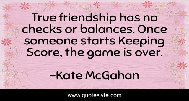 This page presents the quote "True friendship has no checks or balances. Once someone starts Keeping Score, the game is over.". Author of this quote is Kate McGahan. This quote is about keep-score, love, quid-pro-quo, game, balance, friendship, affection,.