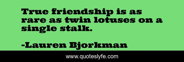 This page presents the quote "True friendship is as rare as twin lotuses on a single stalk.". Author of this quote is Lauren Bjorkman. This quote is about friends, friendship-true-and-loyal, friendship,.