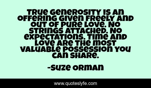 This page presents the quote "True generosity is an offering given freely and out of pure love. No strings attached. No expectations. Time and love are the most valuable possession you can share.". Author of this quote is Suze Orman. This quote is about generosity, time,.