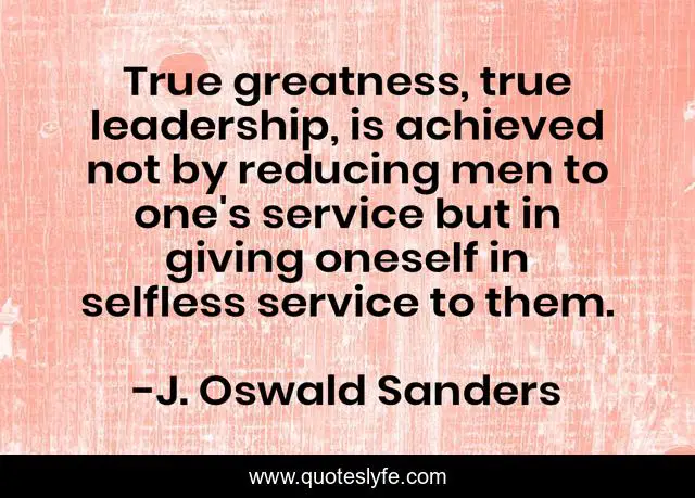 This page presents the quote "True greatness, true leadership, is achieved not by reducing men to one's service but in giving oneself in selfless service to them.". Author of this quote is J. Oswald Sanders. .