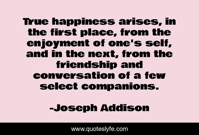This page presents the quote "True happiness arises, in the first place, from the enjoyment of one's self, and in the next, from the friendship and conversation of a few select companions.". Author of this quote is Joseph Addison. This quote is about self, friendship,.