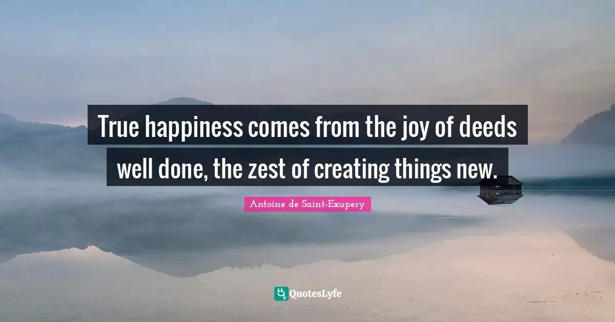This page presents the quote "True happiness comes from the joy of deeds well done, the zest of creating things new.". Author of this quote is Antoine de Saint-Exupery. This quote is about joy, true, well done,.