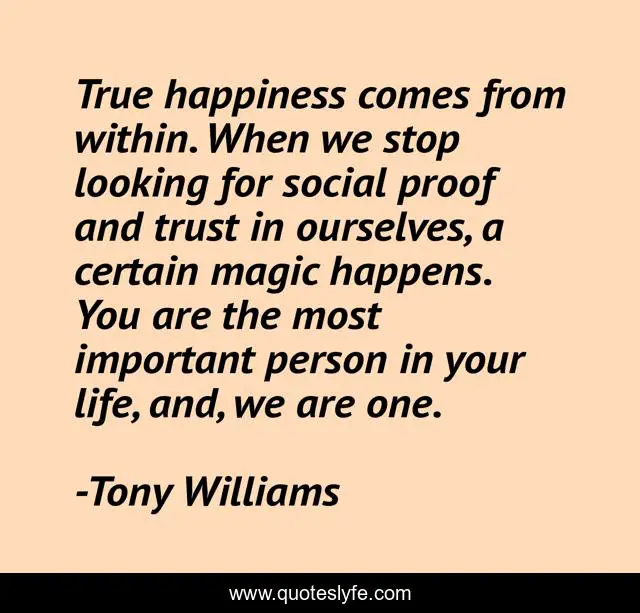This page presents the quote "True happiness comes from within. When we stop looking for social proof and trust in ourselves, a certain magic happens. You are the most important person in your life, and, we are one.". Author of this quote is Tony Williams. This quote is about life, wisdom, behaviour, attitude, life-lessons, happiness,.