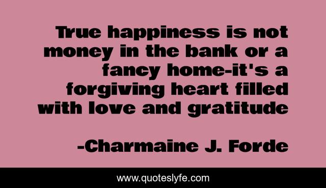 This page presents the quote "True happiness is not money in the bank or a fancy home-it's a forgiving heart filled with love and gratitude". Author of this quote is Charmaine J. Forde. This quote is about gratitude, heart, love, money, true-giving, forgiving, affection,.