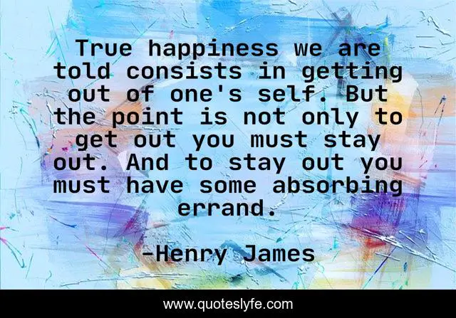 This page presents the quote "True happiness we are told consists in getting out of one's self. But the point is not only to get out you must stay out. And to stay out you must have some absorbing errand.". Author of this quote is Henry James. .